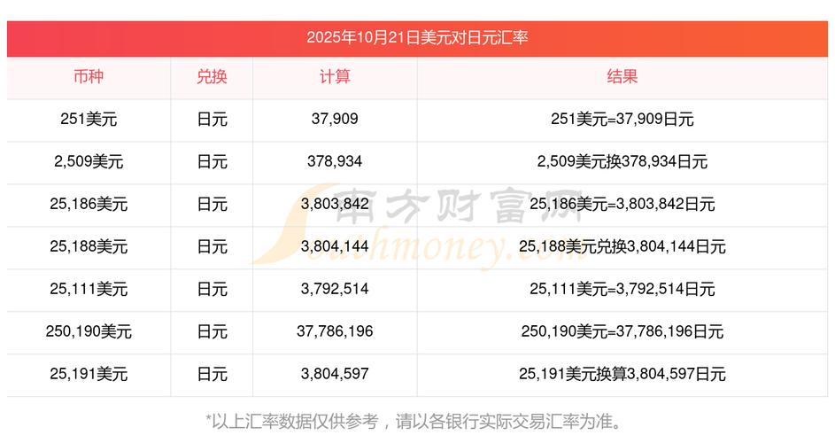 (图片来源网络,侵删)- 直接在 Google 或 百度 搜索 “美元兑日元汇率” 或 “USD JPY”,搜索结果会直接显示来自财经数据提供商的实时报价。