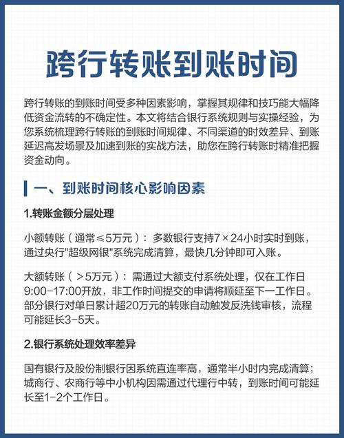 | 大额或敏感转账 | 可能被人工审核,延迟几小时到1天 | 为了反洗钱,大额转账(如超过5万)或账户有异常交易时,银行会进行人工审核,这会导致延迟。 |