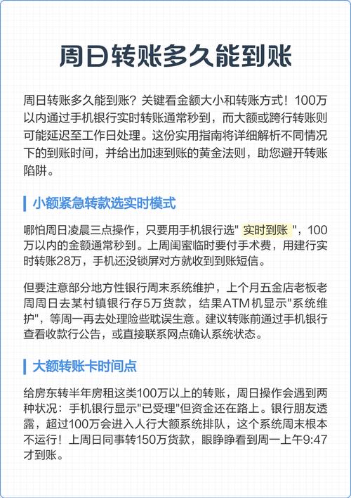 | 跨行转账(非工作时间) | 可能延迟,最长24小时内 | 如晚上、周末、法定节假日,跨行清算系统在非工作时段可能关闭或降低处理频率,导致转账排队。 |