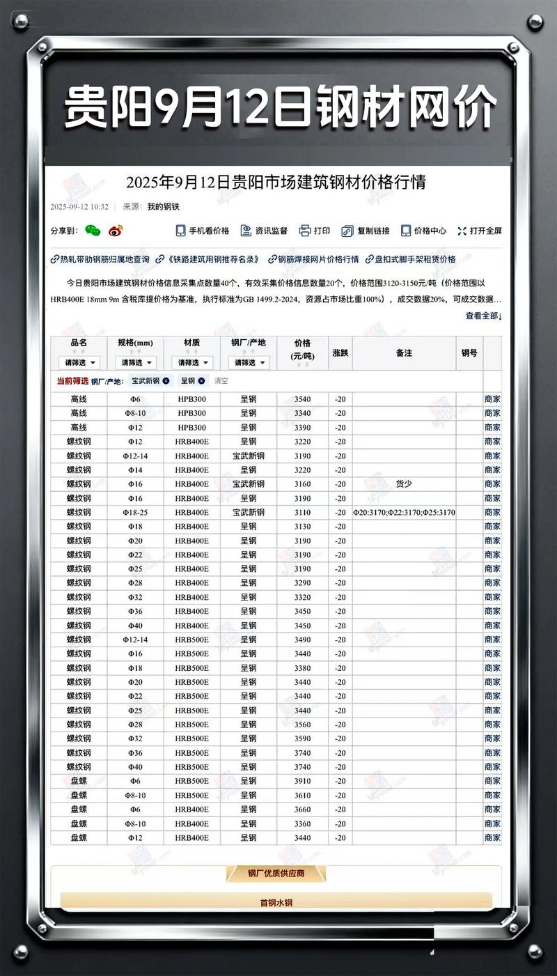 - 我的钢铁网 (Mysteel)、钢之家、找钢网 等行业网站,通常会有“我的钢铁网 - 贵阳价格”等实时行情板块,可以查询到不同品牌的报价。