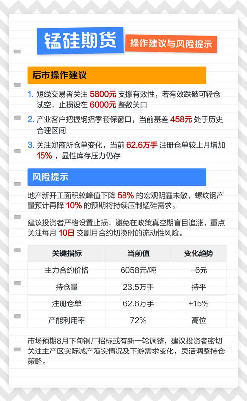 - 短期(1-2个月): 锰硅期货很可能维持区间震荡的格局,下方受到成本线(约8000-8500元/吨)的强力支撑,上方则受到疲软需求和政策担忧的压制,上方阻力位可关注9000-9200元/吨。