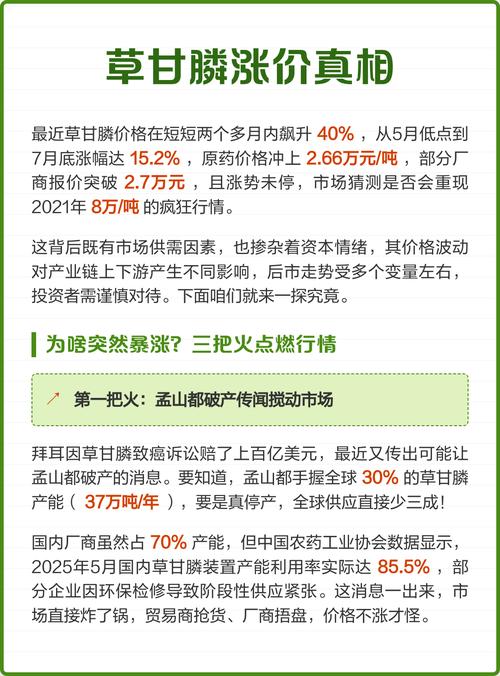 - 价格走势: 经过这一轮周期的洗礼,行业集中度将进一步提高,龙头企业的话语权增强,未来草甘膦的价格中枢可能会比上一轮周期(2025-2025年)有所上移,很难再回到5万元/吨以上的疯狂高点,但跌破3万元/吨的极端低价可能性也大大降低。