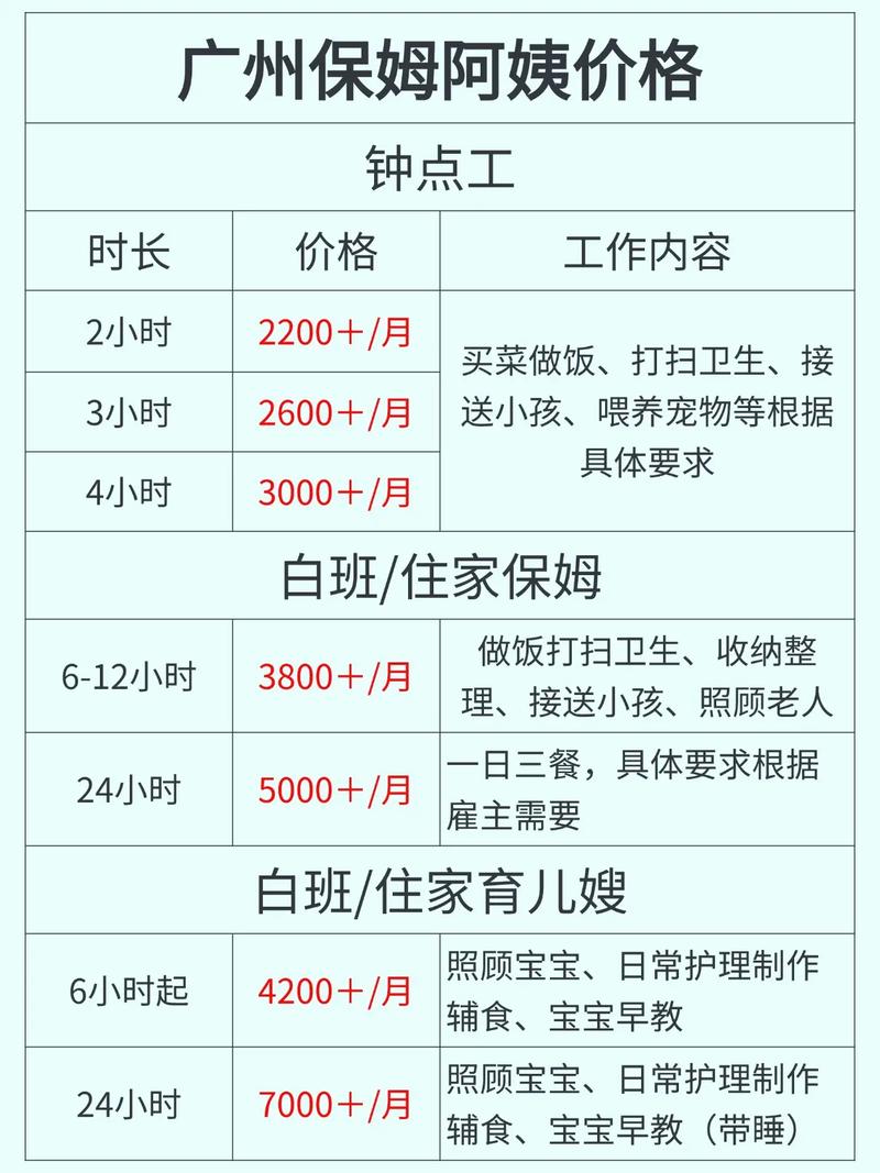- 中心区域:如天河、越秀、海珠等,生活成本高,保姆需求大,价格也偏高。