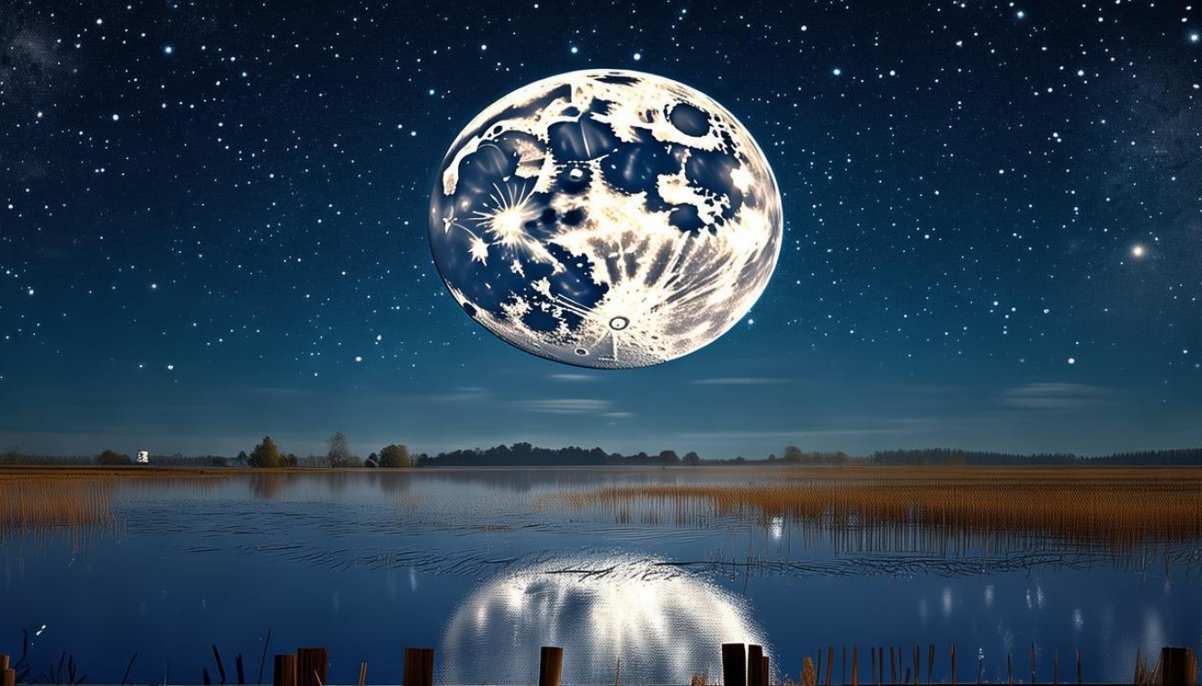 - 作品描述: 皎洁的超级月亮悬挂在城市地标之上,如“天宫”般俯瞰人间,月亮的巨大与建筑的宏伟形成鲜明对比,充满了史诗感。