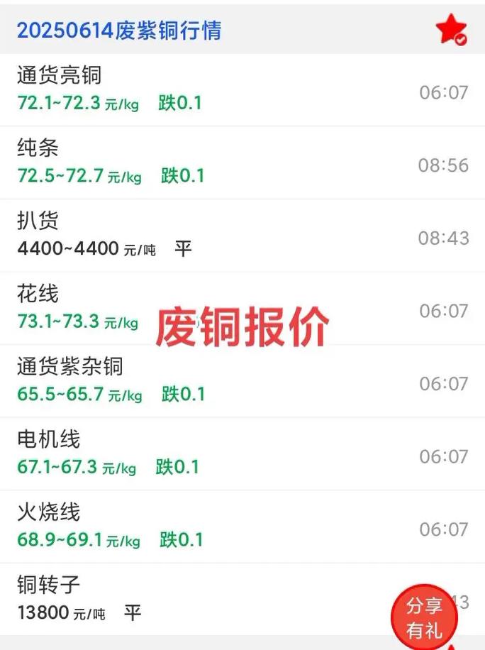 今日废铜实时价格是多少?不同品类废铜价格差异有多大? 废铜价格是实时变动的,并且会因地区、品相、供应商等因素有所不同,以下价格是基于当前市场行情的参考范围,实际交易价格请以您当地回收商的报价为准,今日废铜价格参考 (单位:元/吨)品种价格区间 (元/吨)价格说明1#光亮铜线72,500 - 74,500纯度最高,无杂质,是废铜中的“硬通货”,价格最高,...