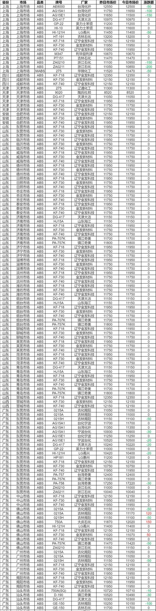 今日ABS行情涨跌如何?