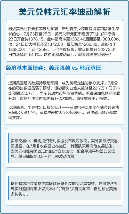 - 全球风险情绪: 当市场风险偏好高时(如投资者乐观),资金会流向风险较高的资产,韩元可能承压,当市场避险情绪升温时,资金会流向美元等避险资产,导致韩元兑美元贬值。