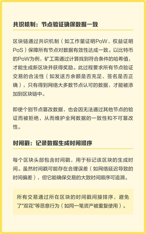 - 共识机制:新区块的添加需要网络中大多数节点(如比特币的矿工、以太坊的验证者)的共识,想要恶意篡改数据,你需要控制网络中超过51%的算力(或权益),这在大型公链(如比特币、以太坊)上是几乎不可能完成的任务,成本极高。