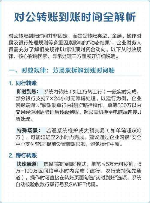 公对公转账没有绝对的“实时”到账,但主流银行都提供了“实时”或“准实时”的选项,最快可以在几分钟内到账,下面我将为您详细拆解,并提供一个清晰的总结,核心结论:最快多久到账?在最优条... 公对公转账没有绝对的“实时”到账,但主流银行都提供了“实时”或“准实时”的选项,最快可以在几分钟内到账。