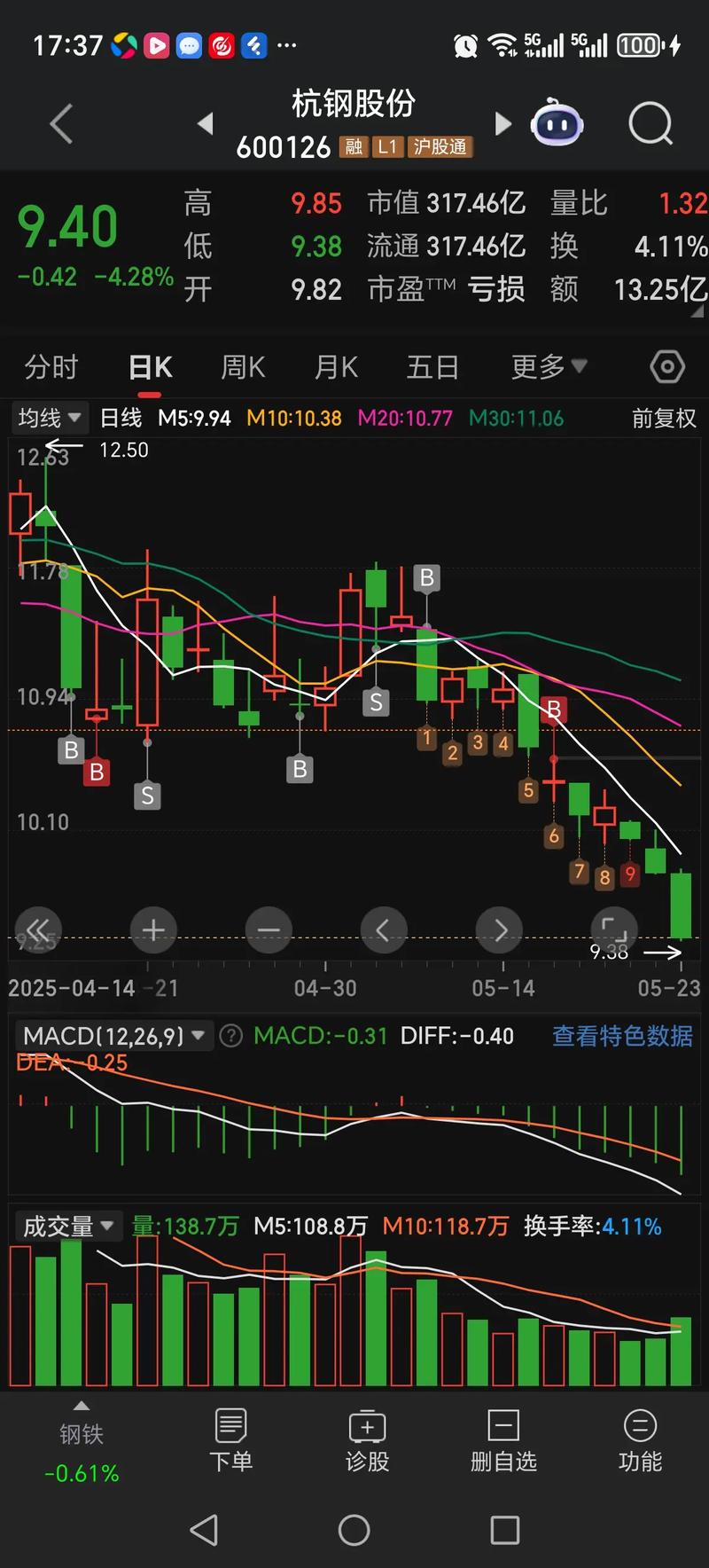 - 观察: S”成交量大、频率高,而股价跌幅不大,可能说明在“出货”,主力在悄悄派发筹码。