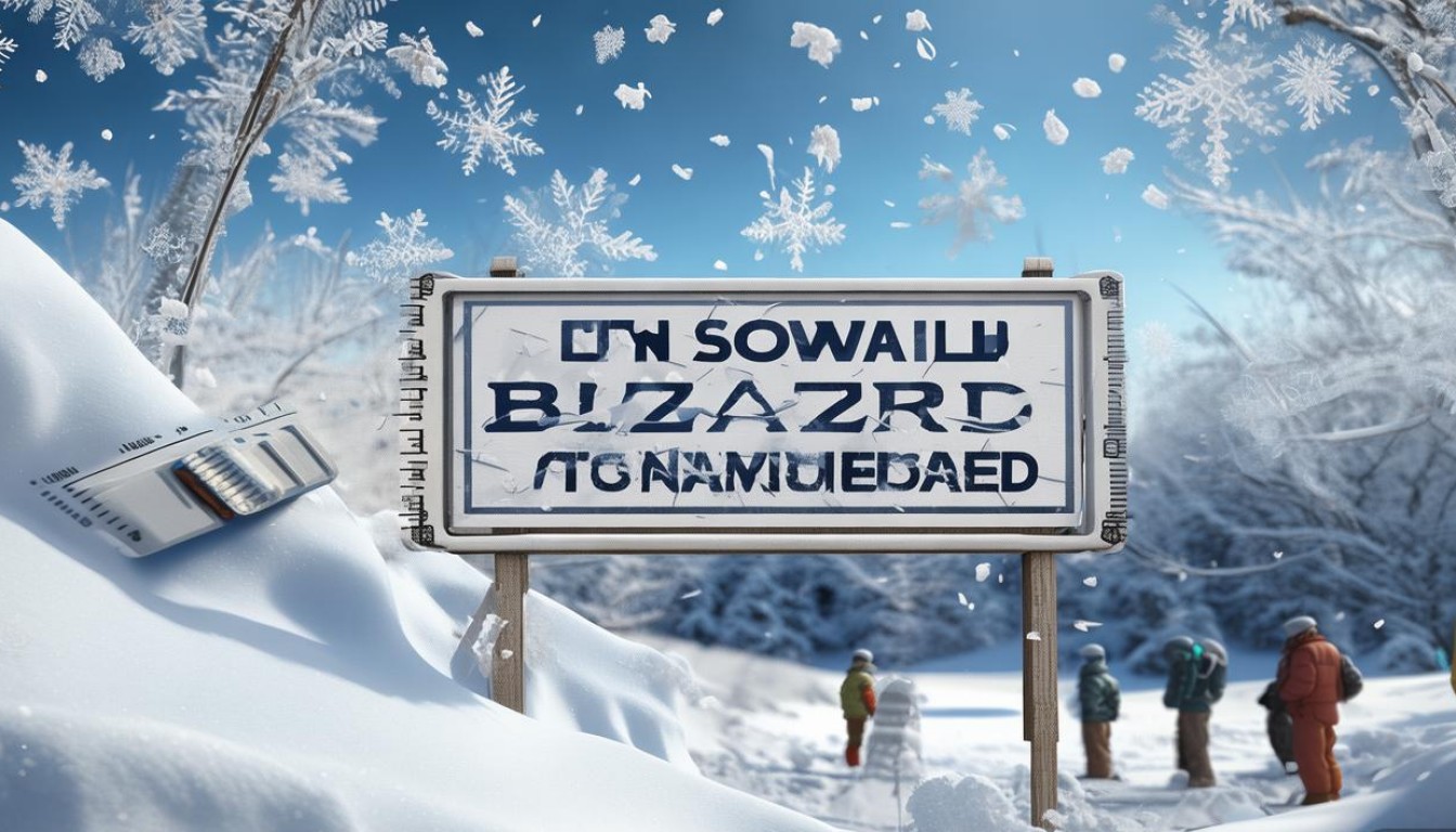 “伴随强风(风速通常 ≥ 35英里/小时,即约56公里/小时)的持续降雪,或因强风导致大量雪被吹起,使得能见度降低到1/4英里(约400米)以下,并持续至少3小时。”